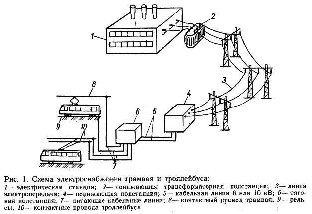 Трамваи и электрические железные дороги используют для электроснабжения э. п. с. контактный провод и ходовые рельсы в качестве обратного провода.
