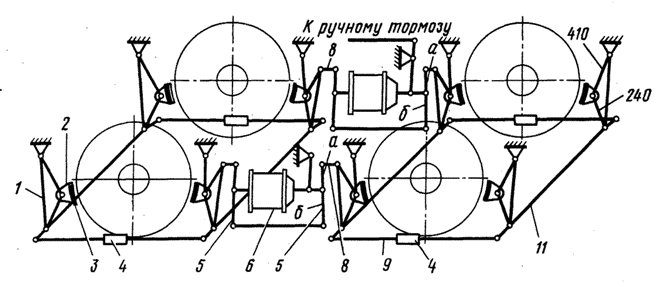 1-подвеска, 2-башмак, 3-тормозная колодка, 4-регулировочная муфта, 5-главные балансиры, 6-тормозной цилиндр, 7-отпскная пружина, 8-соединительная серьга, 9-тяга, 10-предохранительная скоба, 11-тормозная балка, 12-болт для регулировки зазора между колодкой и колесом