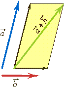 Один из них надо перенести параллельно самому себе, чтобы начала совместились. Построить на них параллелограмм (желтый по рисунку) и провести в нём диагональ. Эта диагональ и есть вектор, равный сумме двух исходных векторов.