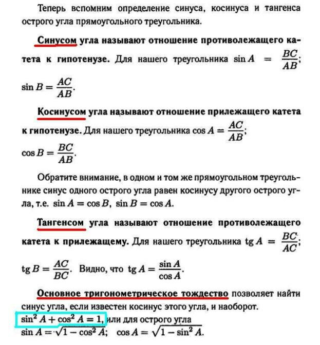 Основное тригонометрическое тождество обведено зеленой рамочкой. Оно читается так: квадрат синуса угла плюс квадрат косинуса того же угла равно единице. Из него, как видите, элементарно найти косинус, если известен синус, и наоборот найти неизвестный синус по известному косинусу.