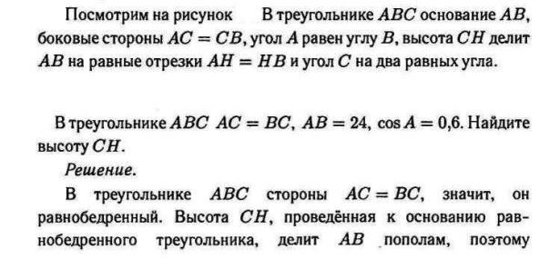 Высота, проведенная к основанию равнобедренного треугольника (то есть между двумя одинаковыми сторонами) одновременно является и МЕДИАНОЙ и БИССЕКТРИССОЙ. Термин МЕДИАНА означает, что она делит на равне части сторону треугольника, на которую падает. А БИССЕКТРИССА, как известно, это крыса, которая бегает по углам и делит угол пополам.