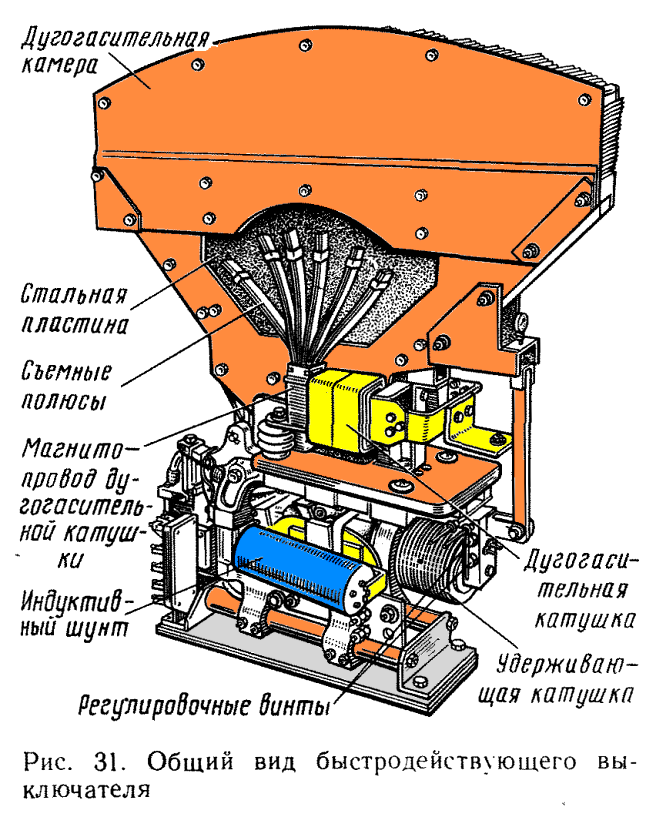 Следовательно, нужен такой защитный аппарат, который при коротких замыканиях или перегрузках был бы в состоянии в минимальное время разрывать защищаемую цепь и быстро гасить электрическую дугу. На электровозах постоянного тока для этой цели служат быстродействующие автоматические выключатели (БВ). С помощью БВ, кроме того, силовую цепь электровоза отключают от контактной сети и подключают к ней. Такие включения и отключения называют оперативными.