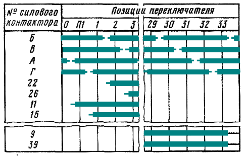 Рис. 69. Диаграмма замыкания контакторов главного контроллера