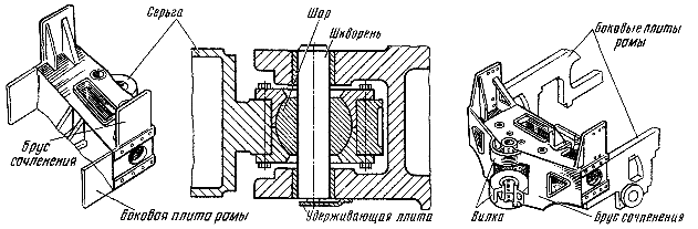 РАМЫ ТЕЛЕЖЕКРамы тележек с помощью рессорного подвешивания опираются на колесные пары. В свою очередь на рамы устанавливают кузов электровоза, крепят к ним тяговые двигатели и тормозное оборудование. Рамы тележек локомотивов передают и распределяют нагрузки между отдельными колесными парами с помощью рессорного подвешивания, воспринимают усилия тяги, торможения, боковые усилия от колесных пар, особенно возрастающие при движении в кривых участках пути. Рис. 106. Сочленение тележек электровоза Брус сочленения одной рамы имеет выступ с отверстием — серьгу. На другой раме тележки на брусе сочленения сделаны два выступа — вилка. В серьгу вставлено гнездо, состоящее из верхнего и нижнего вкладышей. В этом гнезде помещается шар. Через шар и вилку проходит шкворень, который снизу поддерживается специальной плитой. Шкворень позволяет тележкам поворачиваться одна относительно другой в горизонтальной плоскости, а гнездо и шар — в вертикальной. Угол поворота тележек в вертикальной плоскости ограничивается зазором между серьгой и вкладышами. При достижении предельного угла поворота вертикальное усилие, действующее на одну из тележек, передается сочленением на другую тележку. Таким же образом соединяют рамы тележек восьмиосных сочлененных электровозов, которые имеют три узла сочленения. В начало статьи |