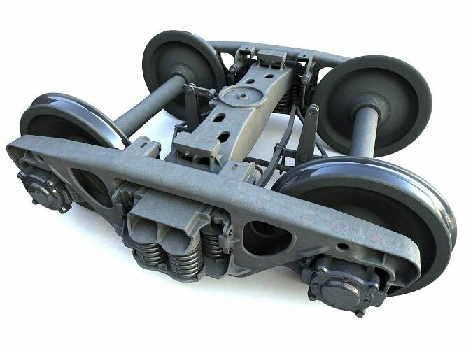 ТЕЛЕЖКА МОДЕЛИ 18-100Основной тип тележки, эксплуатируемой под грузовыми вагонами - двухосная с литыми боковыми рамами типа ЦНИИ-ХЗ (модель 18-100) (ЦНИИ прежнее название ВНИИЖТ, разработавшего данную конструкцию, X - первая буква фамилии автора Ханина, 3 - третий вариант). Данная тележка имеет достаточную прочность и надежность в эксплуатации. До 1972 г. тележку только так и называли - ЦНИИ-ХЗ. Сейчас чаще называют просто по номеру модели 18-100.