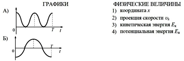 На графиках А и Б показано изменение физических величин, характеризующих движение груза после этого. Установите соответствие между графиками и физическими величинами, зависимости которых от времени эти графики могут представлять. К каждой позиции первого столбца подберите соответсвующую позицию из второго столбца.