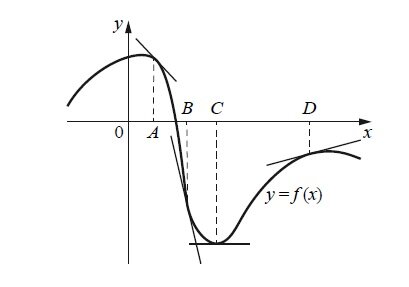 Решение. Надо знать следующее. Если функция возрастает, то её производная в этой точке больше нуля, и касательная идёт вверх (если отслеживать её слева направо). Такое дело мы видим в точке D. Если функция убывет, то производная отрицательна и касательная идёт вниз, как в точках А и В. Если функция имеет перегиб, то производная равна нулю и касательная параллельна оси икс, как в точке С. А как выявить разницу между точками А и В - здесь в обоих случаях касательная идёт вниз. Где минусовое число больше - там касательная идёт вниз круче; то есть точке В соответствует значение - 5,5. Заносим всё это в таблицу
