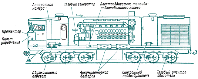 На тепловозах с электрической передачей тяговый (главный) генератор преобразует механическую энергию двигателя внутреннего сгорания в электрическую для питания тяговых электродвигателей. Полученную от тягового генератора электрическую энергию электродвигатели вновь преобразуют в механическую энергию и приводят во вращение движущие колесные пары локомотива. Такова в самых общих чертах схема электрической передачи тепловозов. Кроме тяговых электрических машин, на тепловозах установлены различные дополнительные электрические генераторы и электродвигатели, электрические аппараты и устройства управления, автоматического регулирования работы отдельных агрегатов, защиты оборудования от недопустимых режимов работы. Тепловозы имеют электрические световые сигналы, прожекторы, систему внутреннего и наружного освещения. Для пуска дизелей, а также действия сигналов, освещения при неработающем дизеле используются аккумуляторные батареи. Агрегаты и устройства электрического оборудования объединены для взаимодействия электрическими цепями, выполненными из проводов различного сечения.
