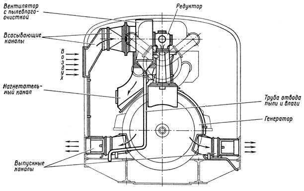 Очищенный от посторонних примесей воздух подается вентилятором по нагнетательному каналу через воздухоподводящий патрубок (см. рис. 143) со стороны, противоположной коллектору. Внутри генератора охлаждающий воздух проходит параллельными потоками через магнитную систему и якорь, отводит от них тепло и выбрасывается наружу через выпускной патрубок в подшипниковом щите и выпускные каналы. Для обеспечения надежной работы тяговых генераторов охлаждающий воздух не должен нести с собой несгоревшее топливо, выбрасываемое дизелем, пыль, влагу. Поэтому очень важным является рациональный выбор места забора охлаждающего воздуха и применение достаточно эффектной его очистки.