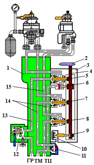 УСТРОЙСТВО БЛОКИРОВКИ ТОРМОЗОВ № 367МРабота блокировки № 367М с интерактивным управлением и анимациейУстройство блокировки тормозов применяется на двухкабинных локомотивах для принудительного затормаживания локомотива при смене кабин управления с отключением крана машиниста и крана вспомогательного тормоза в одной кабине и включения их в другой. Блокировка усл.№ 367м состоит из кронштейна 1, корпуса 3 переключателя, комбинированного крана 17 и коробки 16 с электрическим контактом. К кронштейну 1 подключены трубопроводы от ГР, ТМ и ТЦ, а также от крана машиниста и крана вспомогательного локомотивного тормоза. К кронштейну крепится корпус 12 сигнализатора расхода воздуха. В корпусе 3 переключателя расположен эксцентриковый вал 4, на который насажена съемная ручка 2, имеющая два положения; вертикально вверх - блокировка выключена, вниз - блокировка включена. Ручка 2 может быть снята с вала только при выключенном положении блокировки. В корпусе 3 находятся также клапаны 5, 7 и 8, хвостовики которых уплотнены резиновыми манжетами, и толкатель 9. Клапаны 5, 7 и 8 со стороны дисков нагружены пружинами.