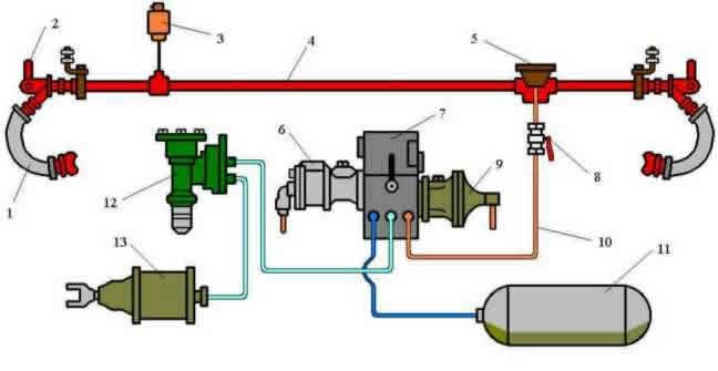 В каждом пассажирском вагоне имеется не менее трех стоп-кранов 4, два из которых расположены в тамбурах вагонов. Запасный резервуар (ЗР) 16 объемом 78 л соединен трубой диаметром 1" (25,4 мм) с кронштейном задней крышки тормозного цилиндра 14. На трубе от запасного резервуара к ТЦ установлен выпускной клапан 15 № 31. На некоторых типах пассажирских вагонов рабочая камера 11 с воздухораспределителями 12 и 13 установлены на отдельном кронштейне, а тормозной цилиндр 14 имеет обычную крышку. Грузовые вагоныДвухкамерный резервуар 7 прикреплен к раме вагона четырьмя болтами и соединен трубопроводом диаметром ?" (19 мм) с пылеловкой 5 через разобщительный кран 8 № 372. С запасным резервуаром (ЗР) 11 объемом 78 л и тормозным цилиндром (ТЦ) 13 диаметром 14" (356 мм) двухкамерный резервуар соединен через автоматический регулятор режимов торможения (авторежим) 12 № 265А. К двухкамерному резервуару 7 прикреплены магистральная 9 и главная 6 части воздухораспределителя № 433.