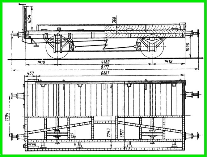 На другом рисунке изображен грузовой вагон – двухосная платформа. Здесь достаточно подробно и четко показана вся тормозная система – колодки, тормозные тяги и рычаги, тормозной винт с рукояткой. Место кондуктора менее комфортно; он, как видно, не сидит, а стоит возле своего тормозного винта.